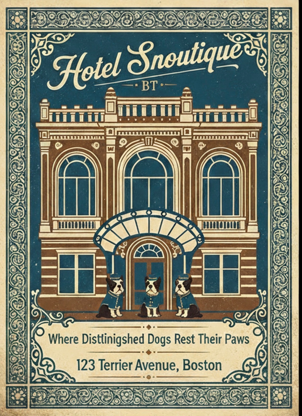 "ボストンテリアとボステリラバー"のためのバケーションシリーズ、"Hotel Snoutique"。